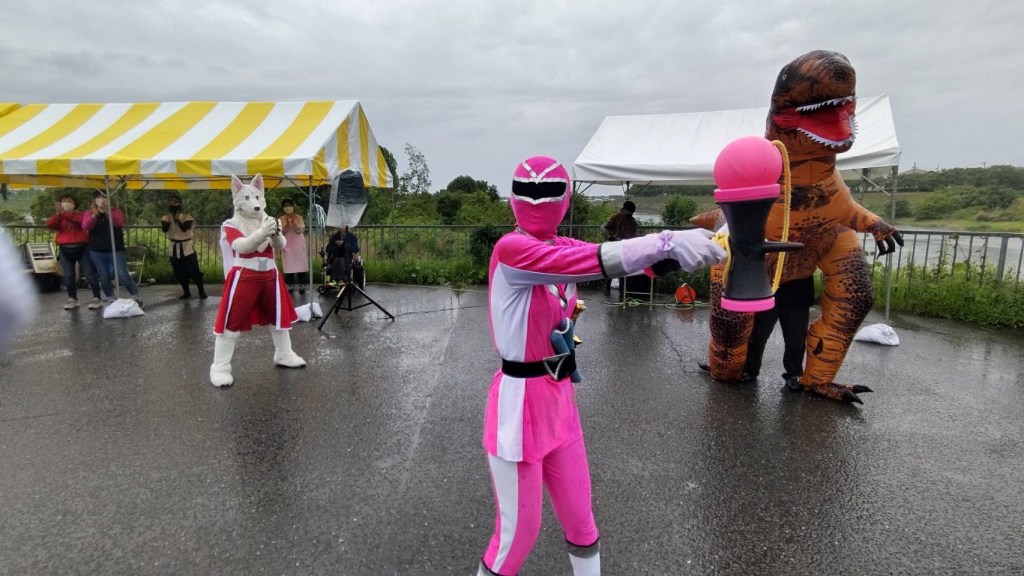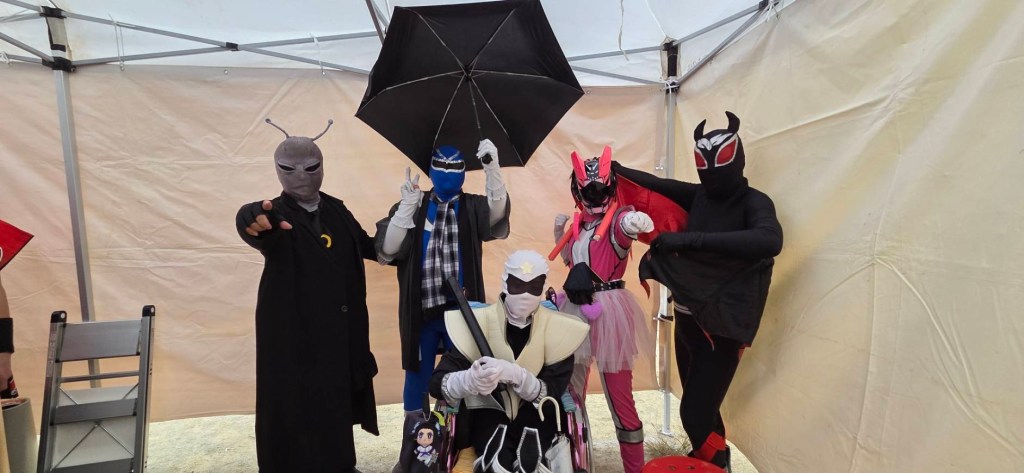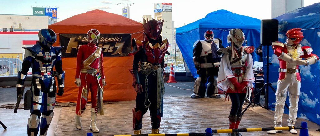 4月13日(日)大阪府富田林市の滝谷不動明王寺で開催の、LOVEとんだばやしに超新星スバルファイブが出演。天気は雨の予報、雨が本降りになる前に時間を早めてショーがスタート。お客さまは傘をさしながら、はげしい戦いを観ていただきました。とにかく地球は守られた。観てくれたみんな、どうもありがとう!