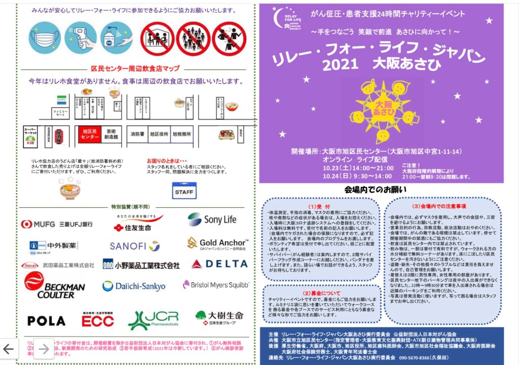 リレー・フォー・ライフ・ジャパン2021大阪あさひは、10月23日(土)午後2時から午後9時、10月24日(日)午前10時から午後2時のイベントです。