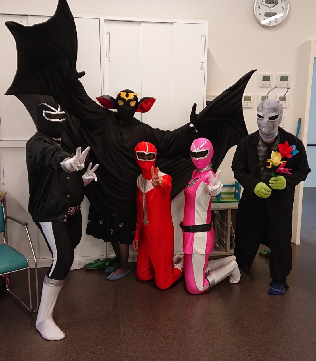 本日のヒーローは、シャア専用レッド、ロボブラック、犬の3人。わるもの軍団からは恐怖蝙蝠男がやってきました。みてくれたみんな、どうもありがとう。くわしくは、ホームページ